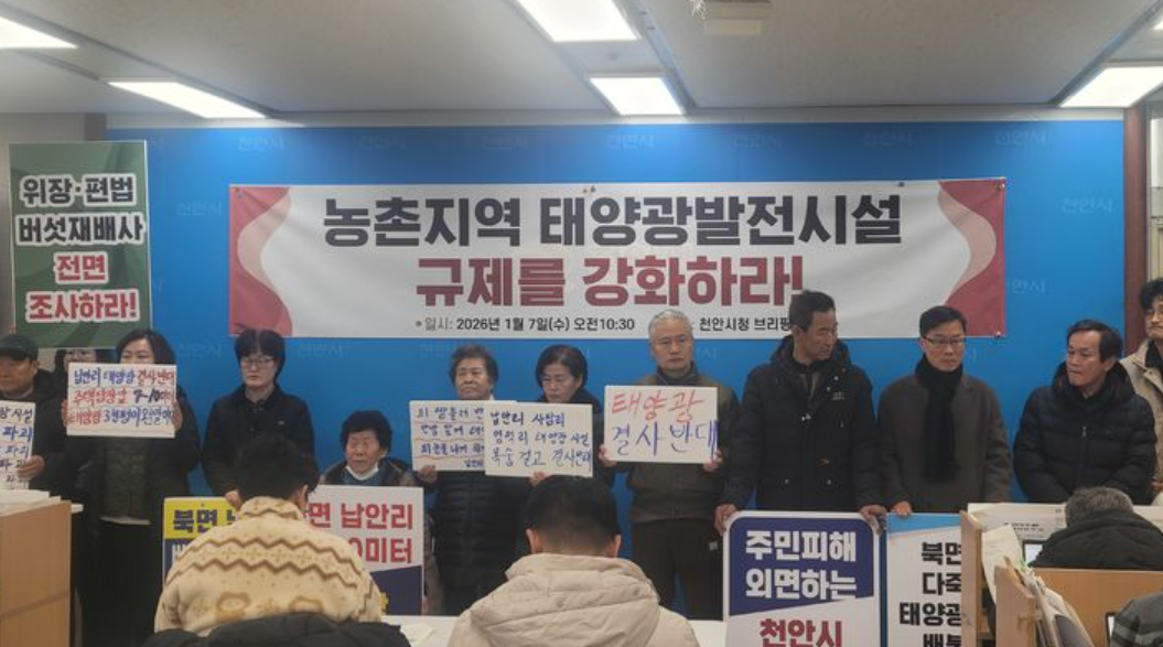 주민대책위원회는 7일 오전 천안시청 브리핑실에서 기자회견을 열고 "농촌지역을 잠식하는 무분별한 태양광 난개발을 즉각 중단하고 개발행위 허가 기준과 도시계획 조례를 강화하라"고 시와 시의회에 촉구했다.