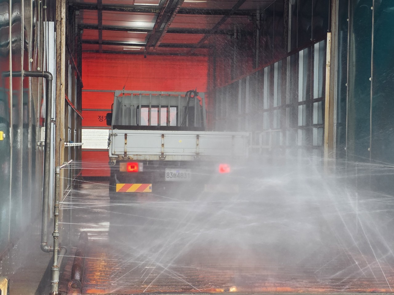 사진=축산차량이 천안시 목천 거점소독시설에서 소독하고 있다.
