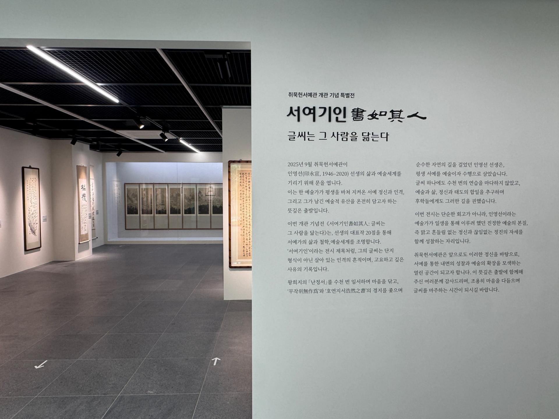 취묵헌서예관은 전통 서예문화를 주제로 한 실내 전시공간으로, 서예가 인영선 선생의 작품과 아카이브, 영상 자료 등을 전시하고 있다. 가을 분위기와 어울리는 서예 작품들이 실내 공간에서 조용한 몰입을 돕는 문화 힐링 공간으로 떠오르고 있다.