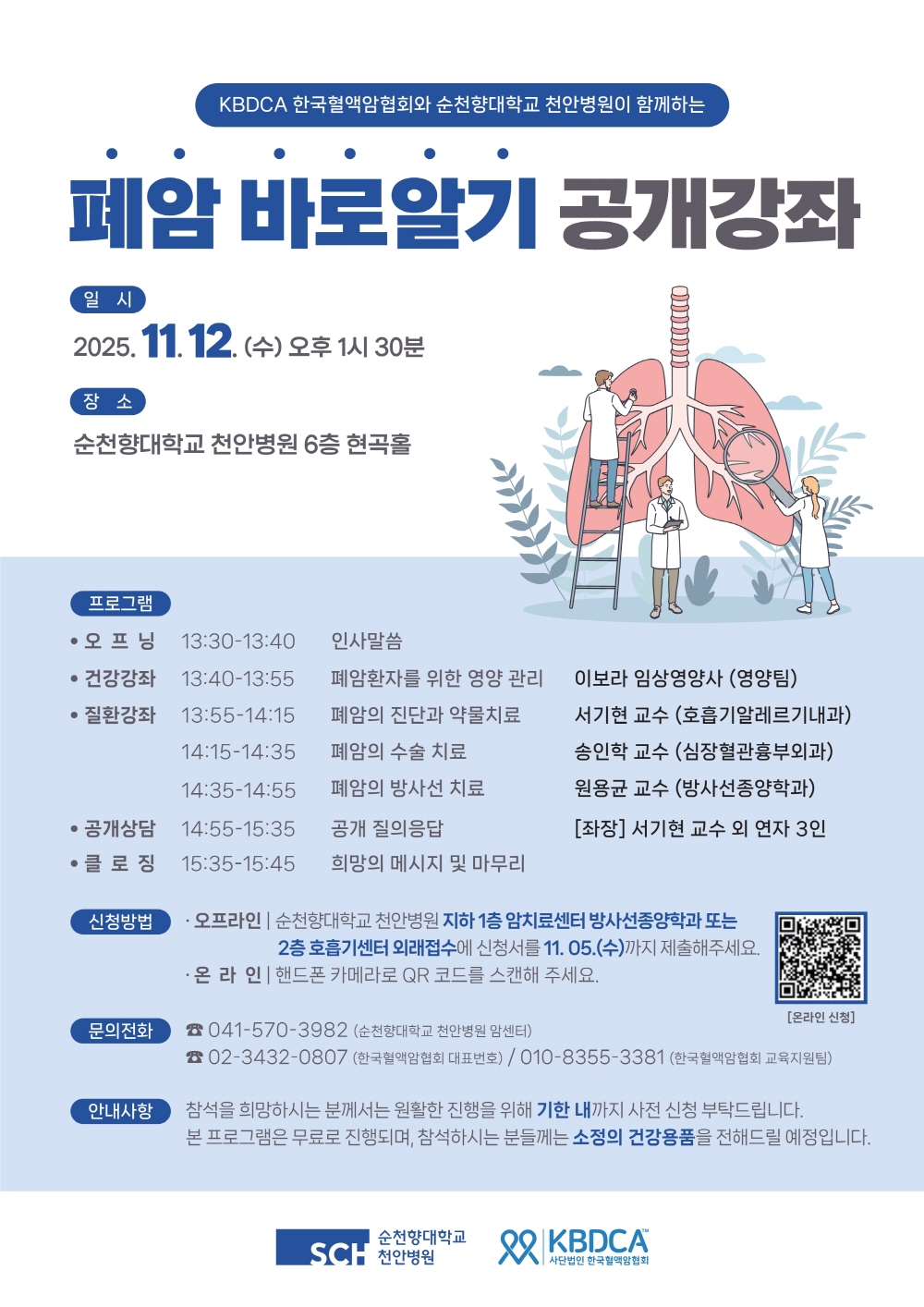사진=순천향대천안병원이 오는 11월 12일 오후 폐암 환자 및 보호자를 대상으로 ‘폐암 바로알기 공개강좌’를 개최한다. 폐암 바로알기 공개강좌 포스터.